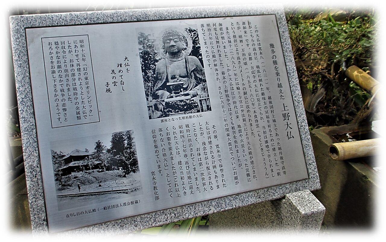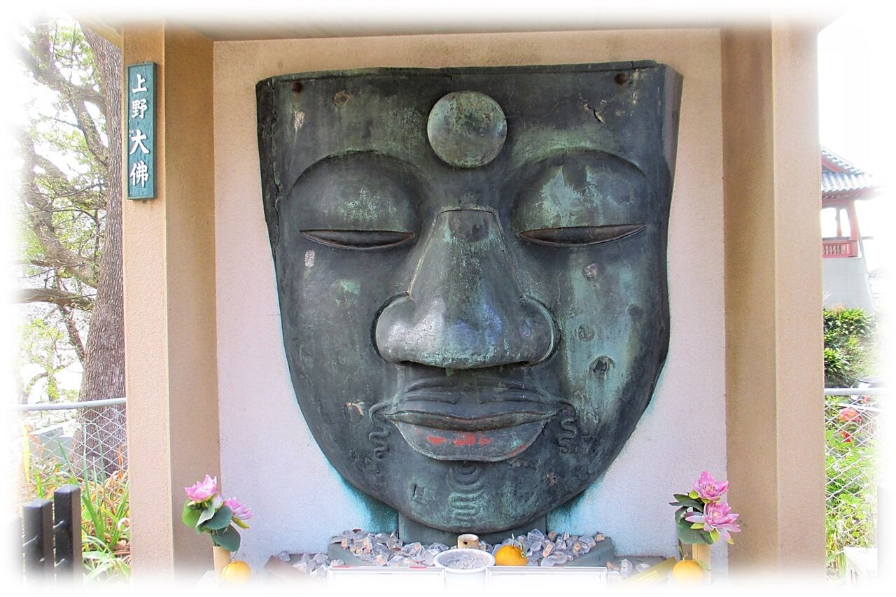 1873年(明治6)に上野公園造営に伴い大仏殿は解体され大仏は露わになります、そしてあの関東大震災が起きその際に大仏の顔の部分が剥落してしまったようです。
