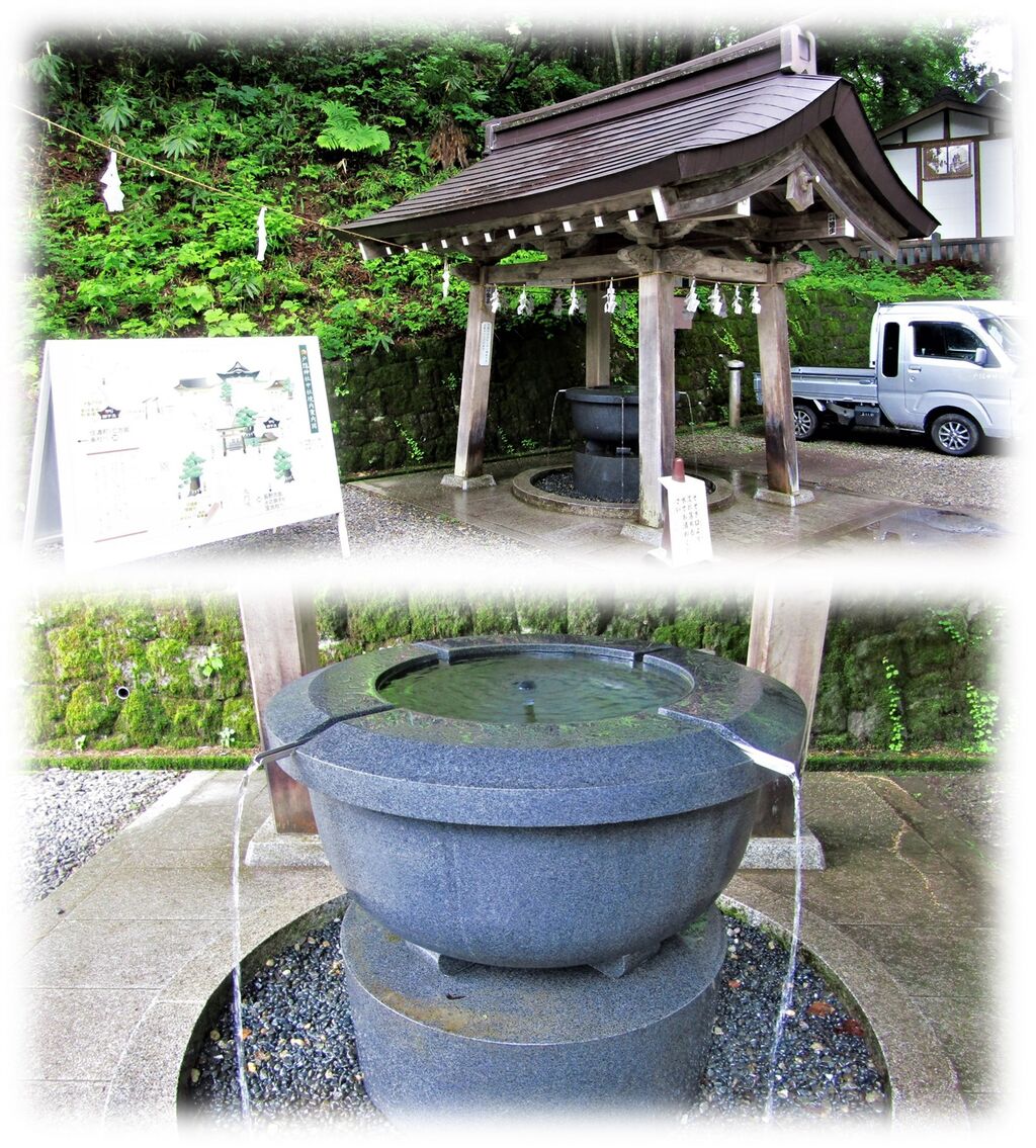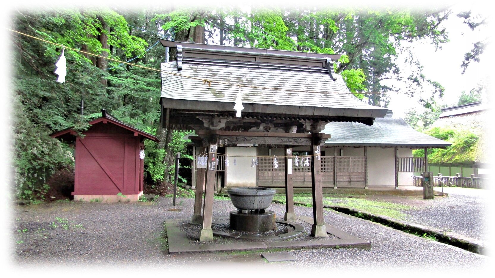手水舎と左の赤い覆屋は日吉社、後方が五斎神社。