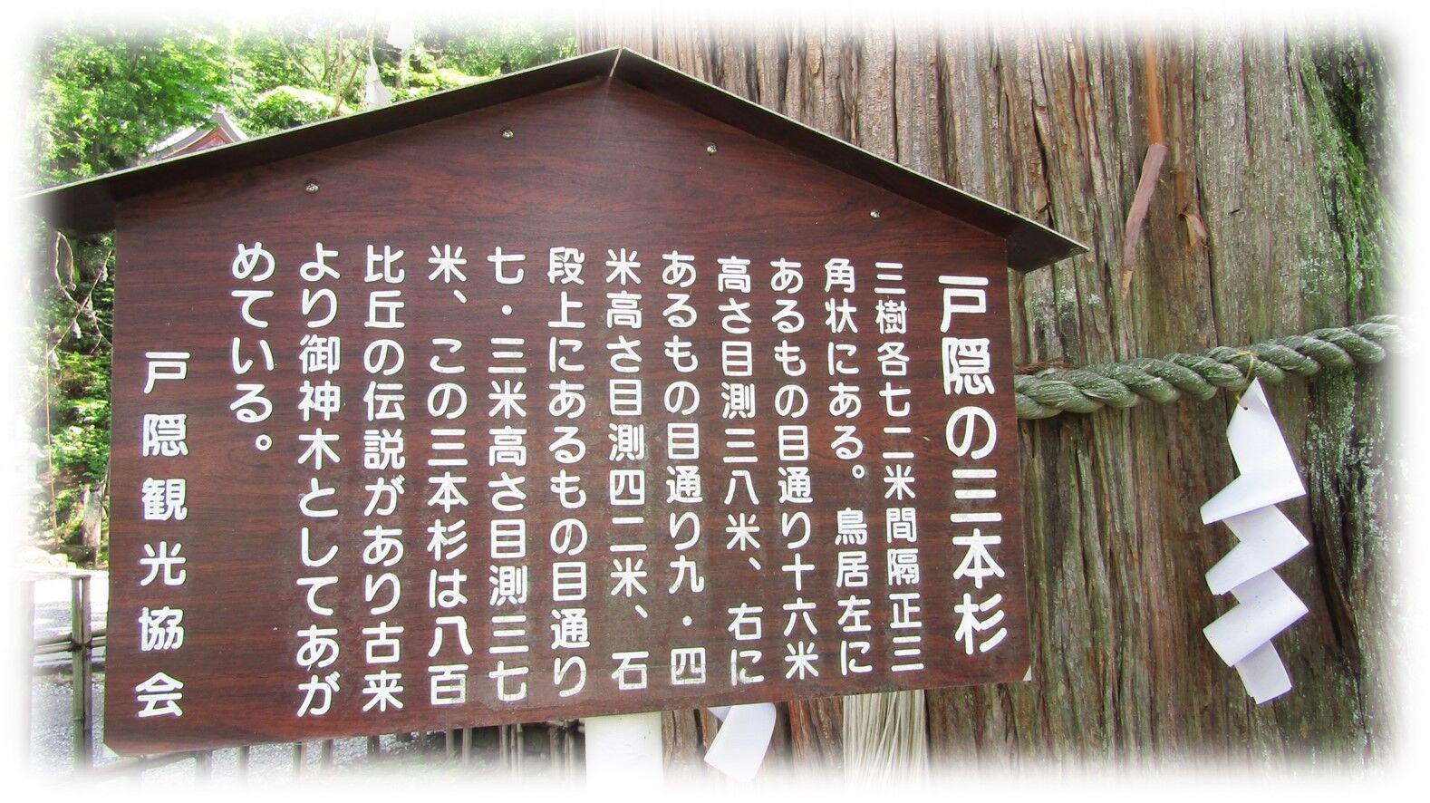 鳥居の左右と鳥居の先に3本の大きな杉が72㍍の間隔で三角の配置で聳えています。