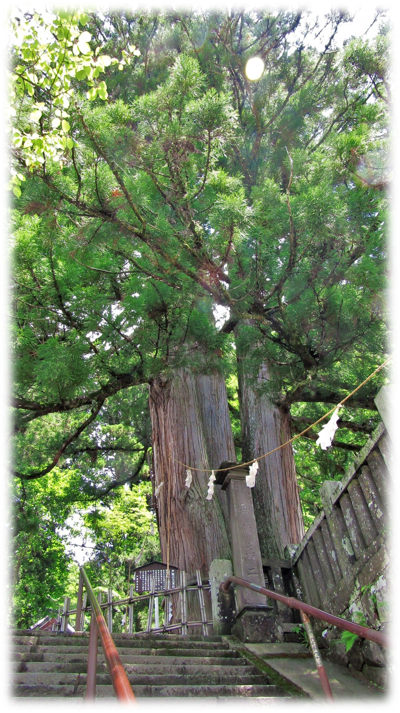 石段を上る参拝者を見下ろすように聳える杉の巨木、三本が寄り添うように聳えているのでこれが「三本杉」と思われるかもしれませんが、これはその中の一本。