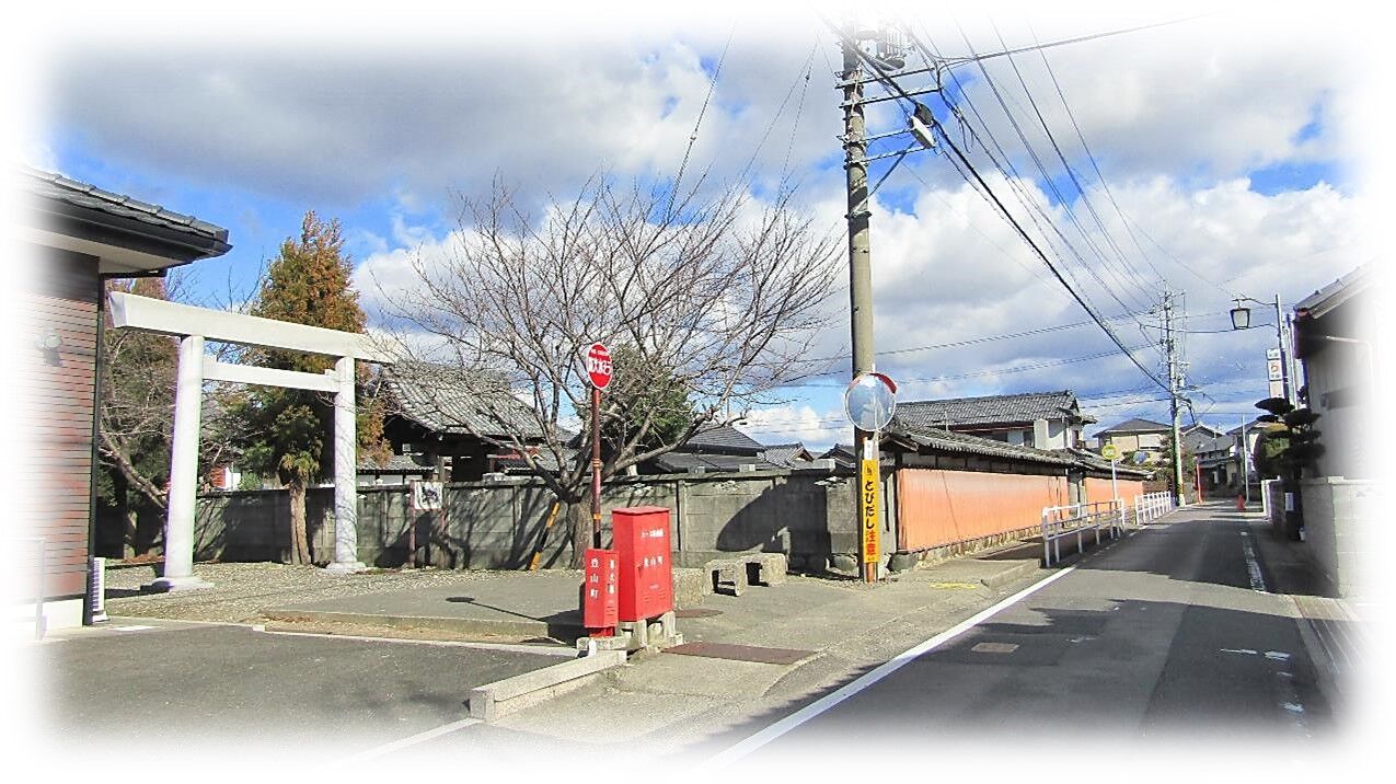 鳥居から南に伸びる通り、写真中央の三叉路の角に小さな堂が見えます。