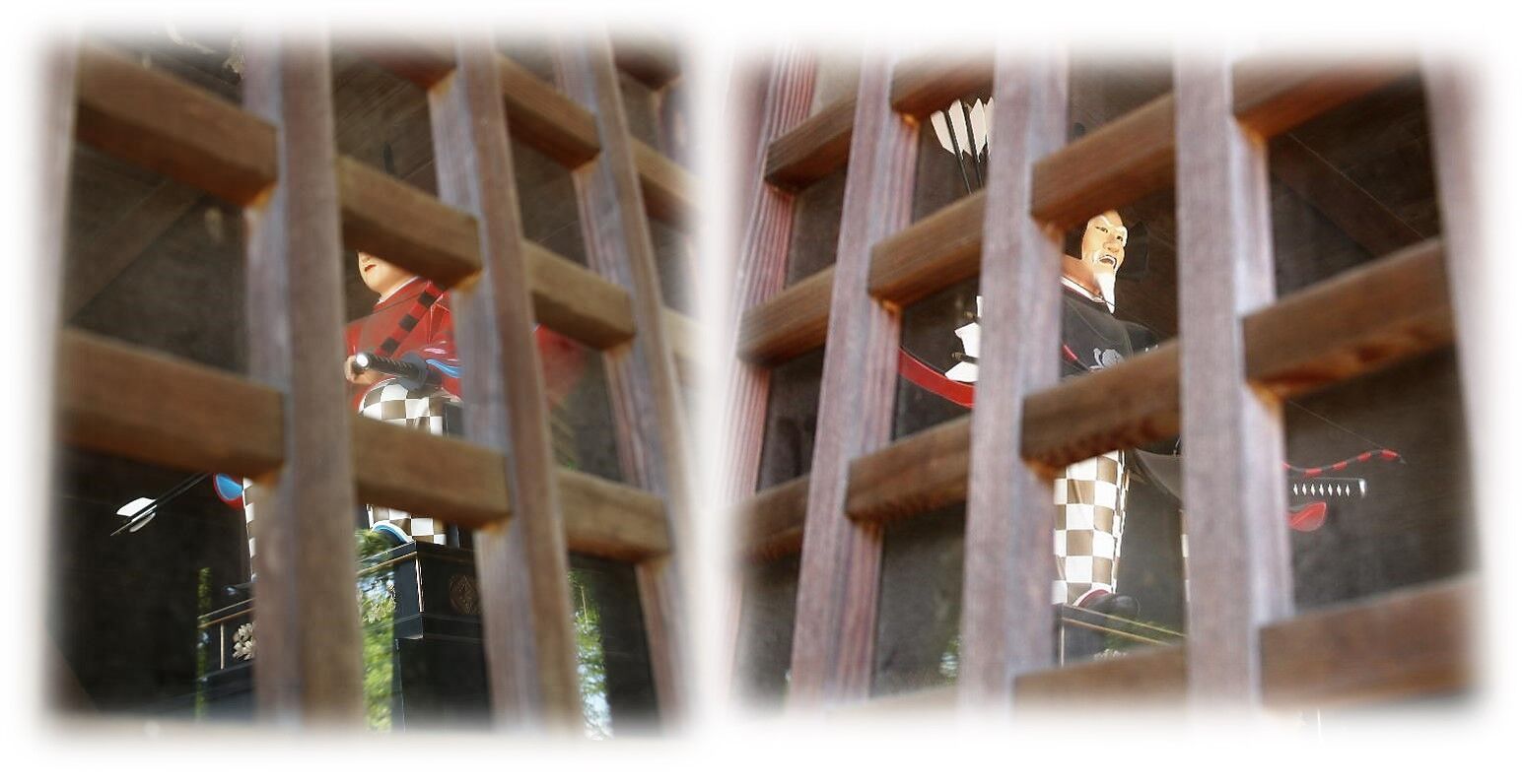 戦国時代の山城の城門としては最古級とされる城門2棟は、神社北門、西門として移築されこうして現存するが、櫓は1970年代の火災で焼失したと云う。
