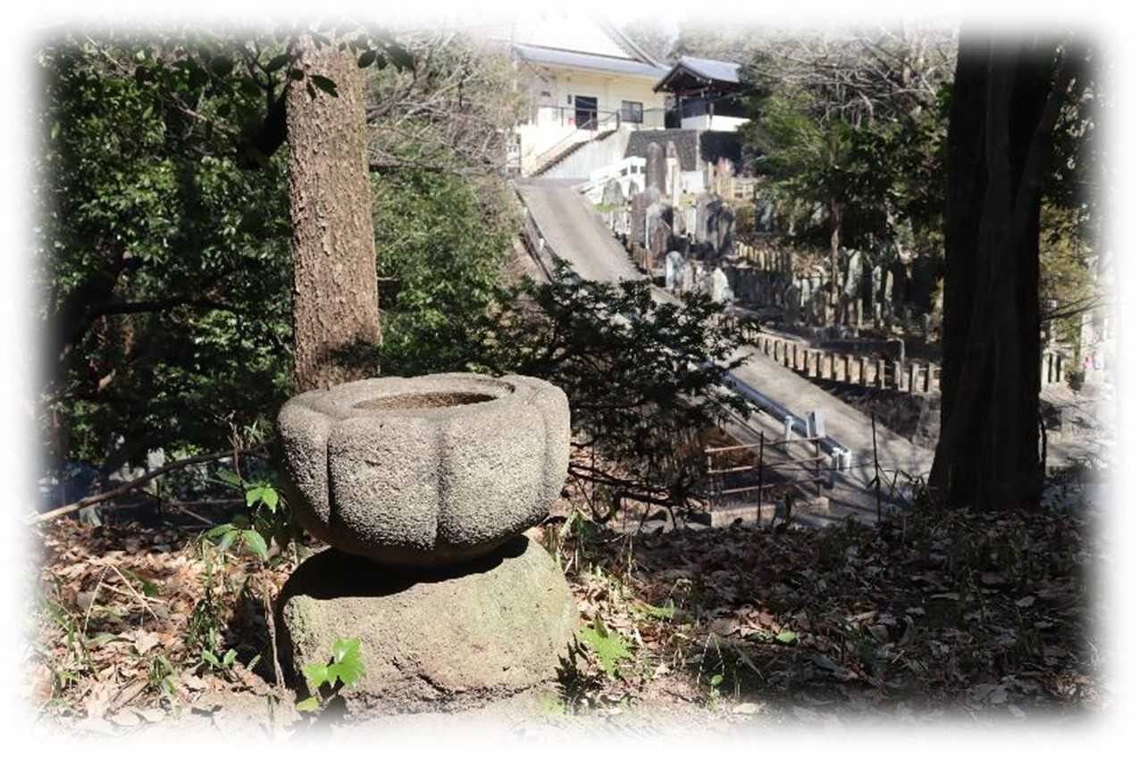 境内右の手水鉢、後方に見える建物は御嶽社社務所。