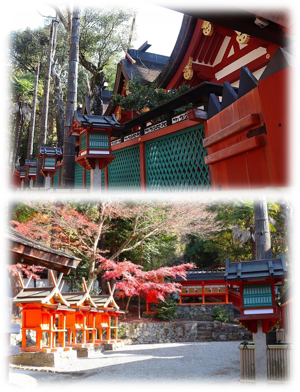 後殿の門から望む春日造の本殿4棟。