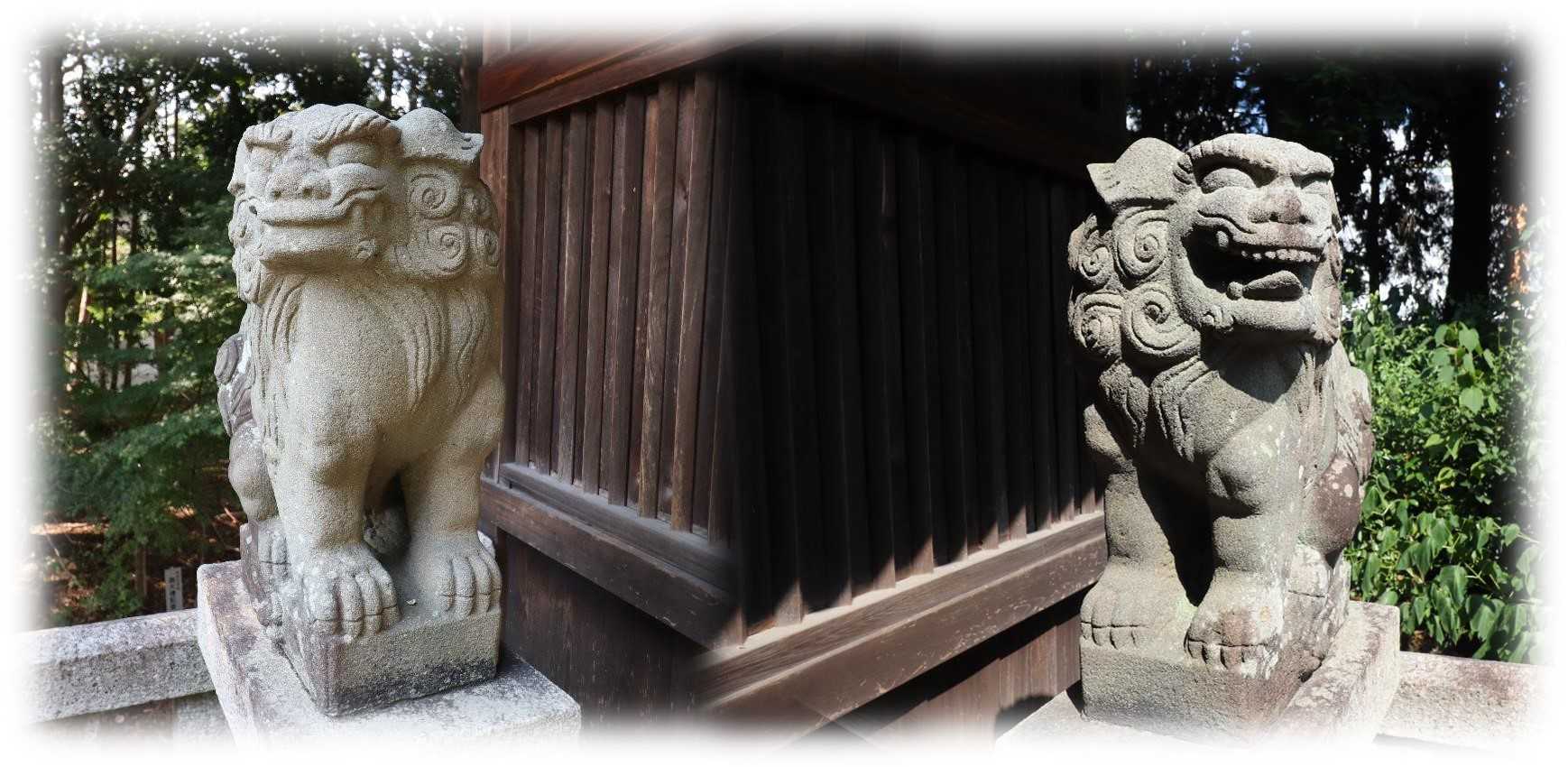 幣殿は切妻造の平入り、手前に一対の狛犬が安置されています。