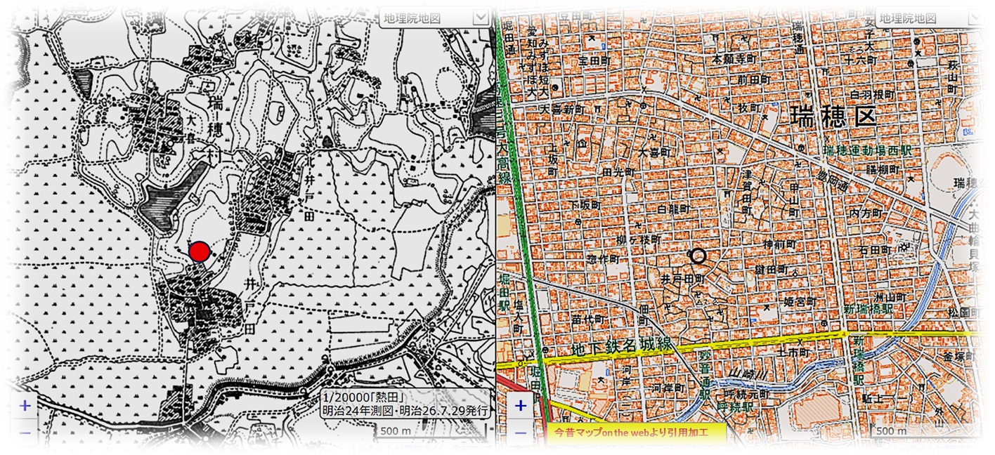 南北に伸びる瑞穂台地の南端近くの高台に位置し、瑞穂通7から西に進むとやがて緩やかな上りとなり、そのピークの左側に白い奉納幟が見えるのが北川天満宮です